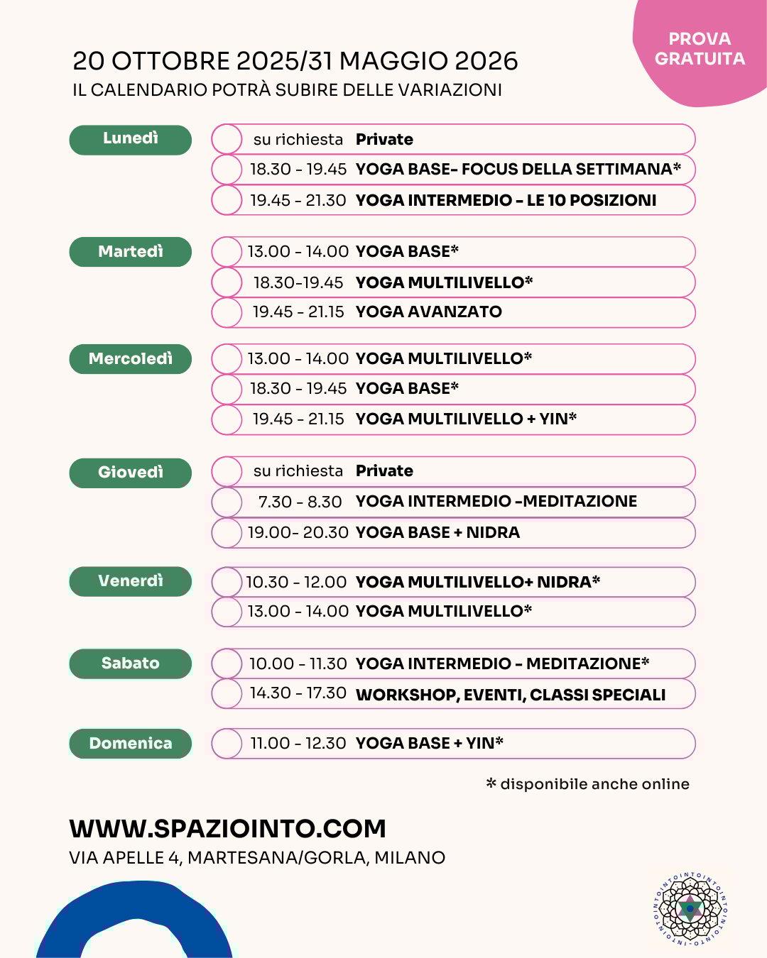YOGA: CALENDARIO E TARIFFE